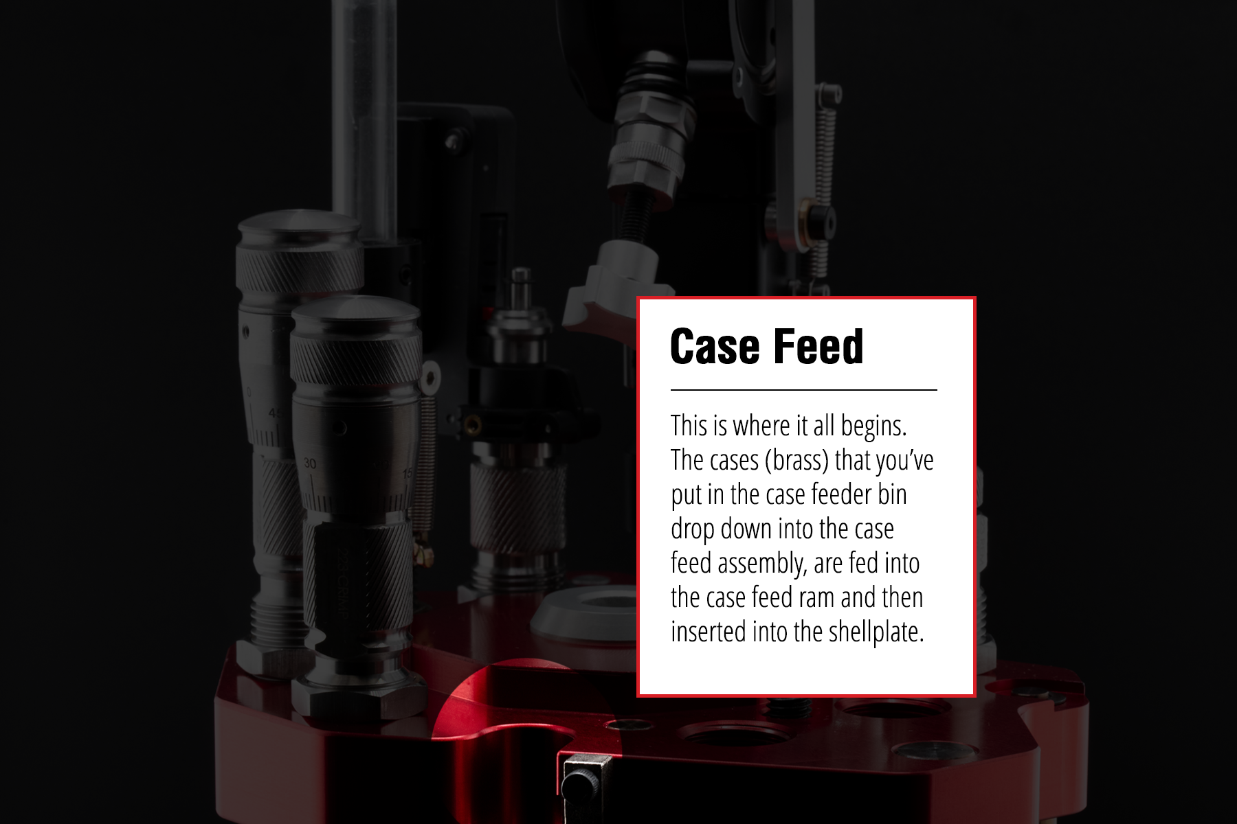 This is where it all begins. The cases (brass) that you’ve put in the case feeder bin drop down into the case feed assembly, are fed into the case feed ram and then inserted into the shellplate. Once the case is in the shellplate, it's carried from station to station through the reloading process.